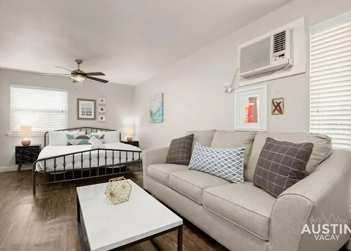 Apartamento Walk To Zilker King Bed Pool Free Parking Austin está situado a unos 10 minutos en coche del Teatro Paramount, y a una distancia de 3 km del Capitolio de Texas. También hay Wi-Fi para que los huéspedes puedan entretenerse o trabajar.